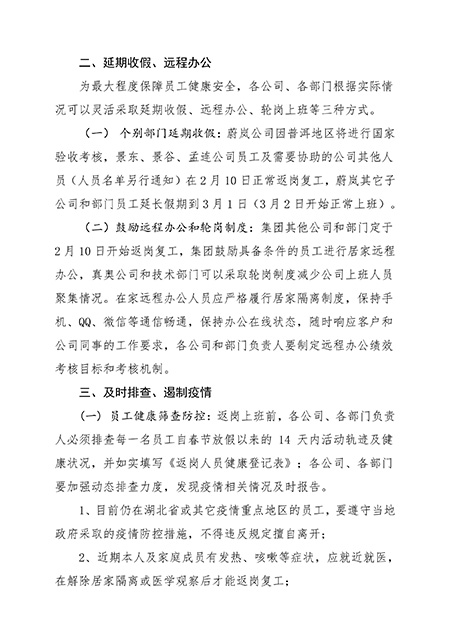 为最大程度保障员工健康安全,各公司、各部门根据实际情况可以灵活采取延期收假、远程办公、轮岗上班等三种方式。