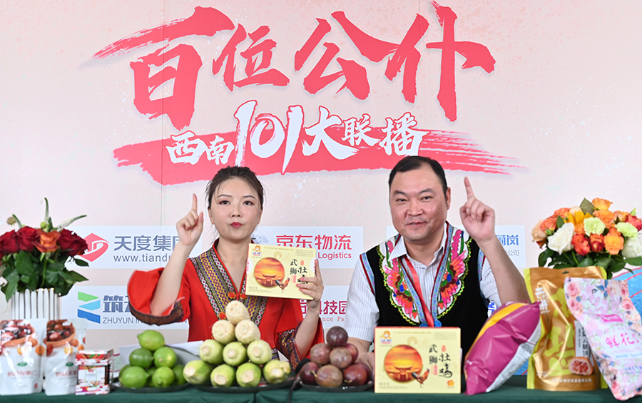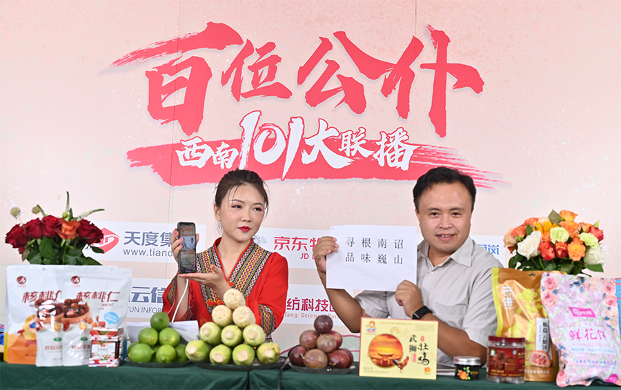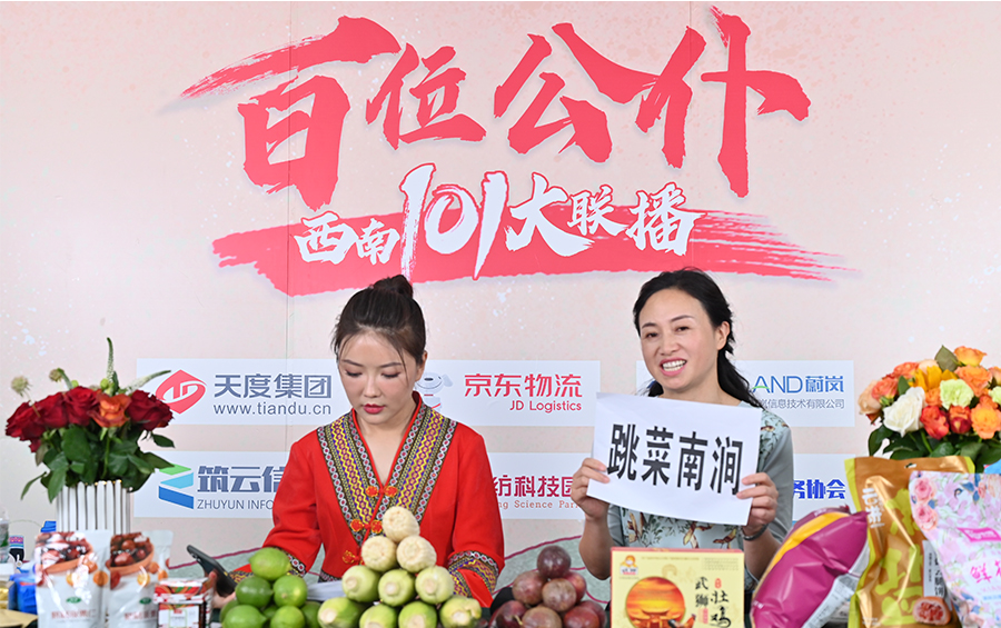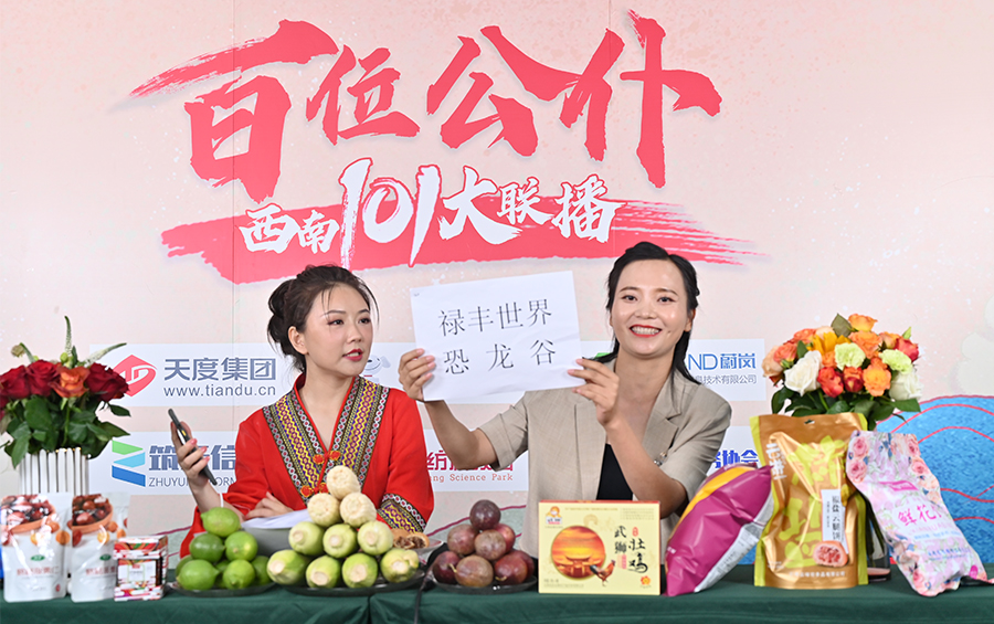 6月17日下午,“百位公仆,西南101大联播”大型助农直播活动在云纺科技园直播基地举行,来自云南巍山、南涧、水富、个旧、开远、彝良、武定、景东、景谷等县(市)的11位副县(市)长,与四川知名电视主持人、直播记者郭秀一同走进直播间,同框出镜,为云南各地好货代言,推动农产品推广上行,助力脱贫攻坚。近3小时的直播中,特色的农产品、实惠的价格,以及丰厚的赠品吸引了260多万网友围观。