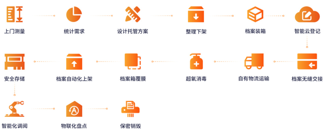 1、清点整理服务:上门测量,设计托管方案,自有物流运输,确保搬迁过程中档案无破损、无遗漏、无丢失、无泄漏。